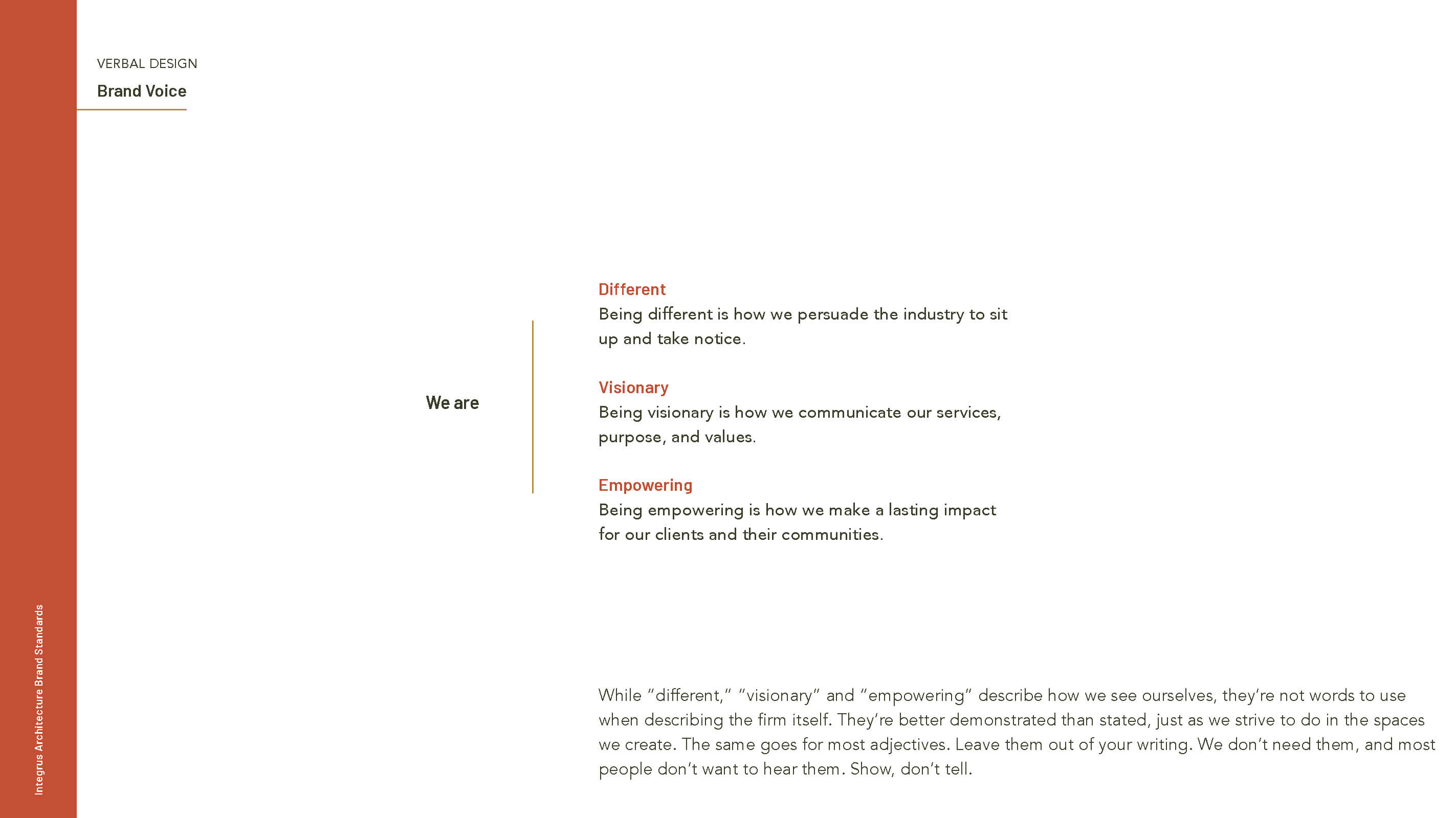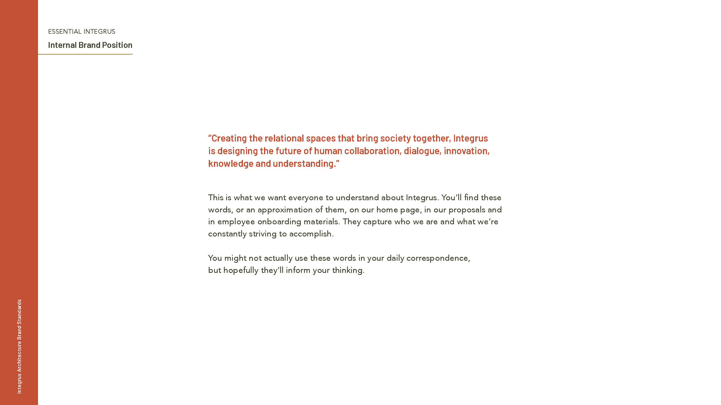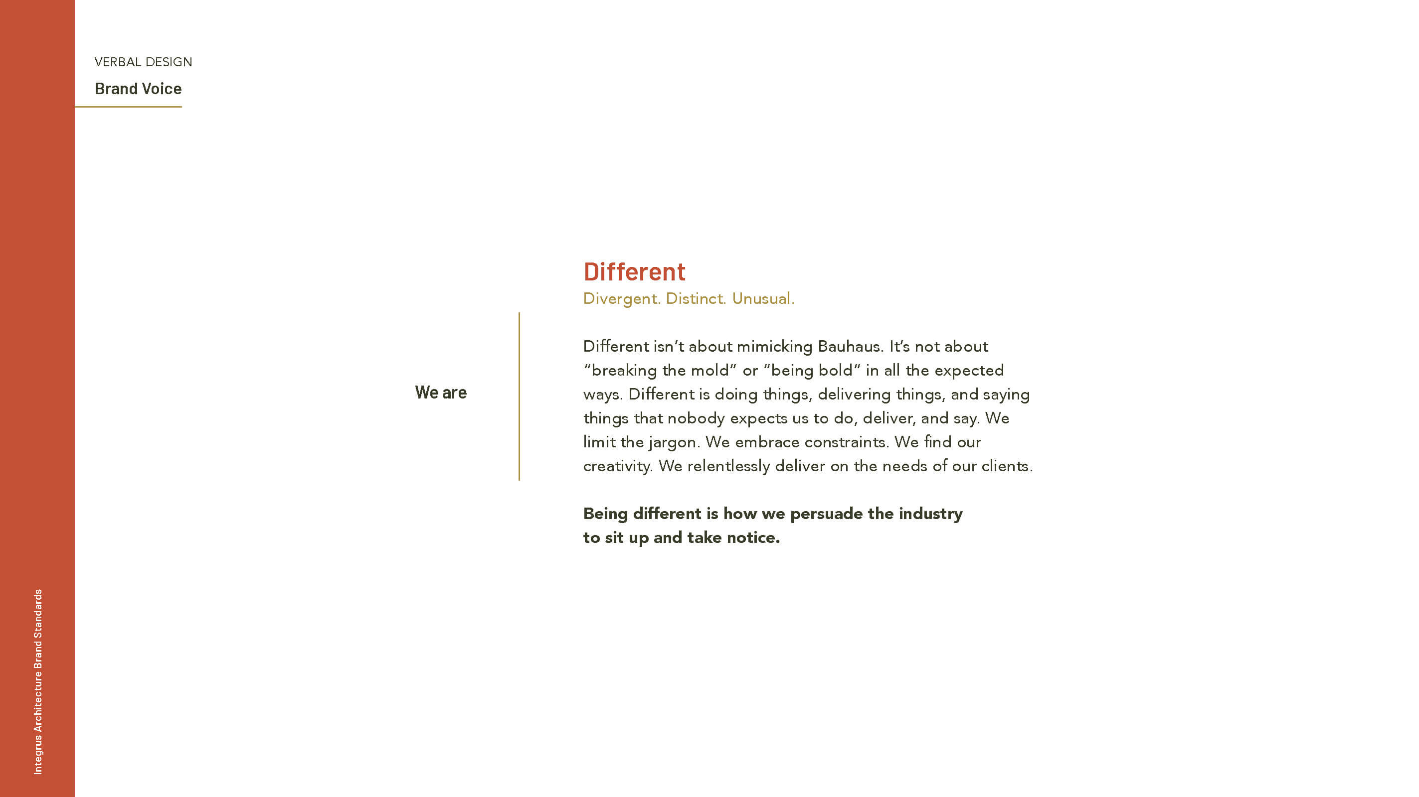 The competitive analysis revealed that many architecture firms struggle with brand differentiation. While stunning portfolios and design excellence are standard, few firms successfully articulate why their approach matters or how their philosophy drives better outcomes for clients. This was a clear opportunity for Integrus—to own a distinct narrative that went beyond aesthetics and spoke to impact.